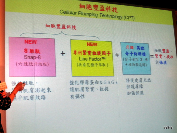 時空彈力8胜肽緊容霜/乳擁有最新的抗老技術「細胞豐盈科技」,從扭轉DNA開始,讓細胞豐盈飽滿,再注入8胜肽讓肌膚表面能立即拉提,伊麗莎白雅頓台灣分公司教育訓練經理曾雪玲表示: 「8胜肽緊容霜/乳擁有最新的抗老技術"細胞豐盈科技Cellular Plumping Technology (CPT)",利用8胜肽與由專利緊實提拉因子Line FactorTM (由扶桑花種子所萃取研發的天然抗老成份),讓肌膚立即豐盈拉提起來,醫學研究證實連續使用 30 天後,紋路深度減少35%,同時8胜肽緊容霜,也擁有SPF30紫外線防護功能,可徹底對抗紫外線的傷害。」